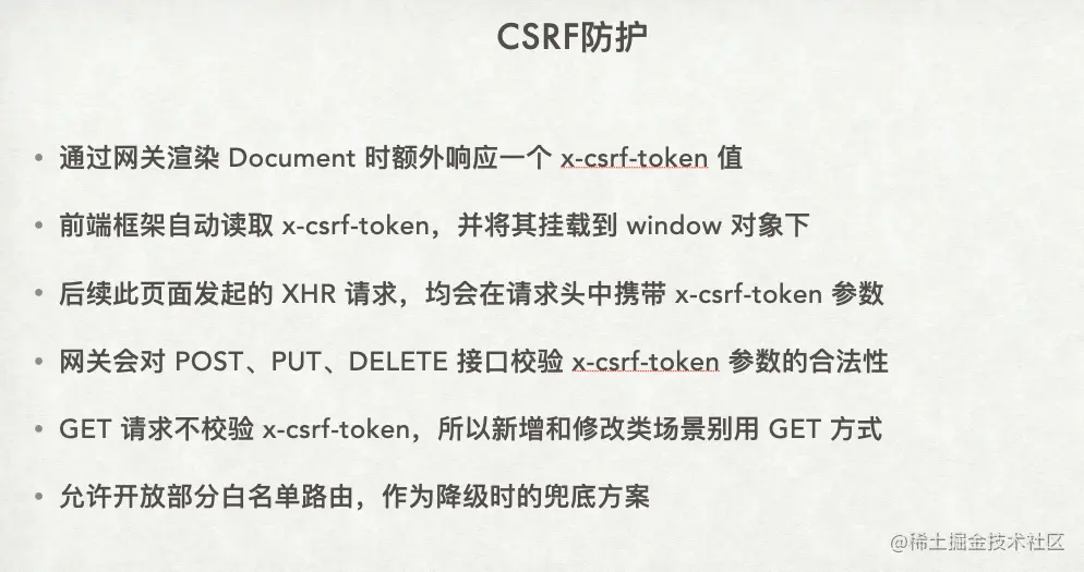 与之前提到的防重攻击方案类似,网关在渲染时会返回一个 token 值,然后前端框架在发起请求时会携带这个 token 值。通常情况下,前端会把 token 放在 cookie 里与登录态一起使用。