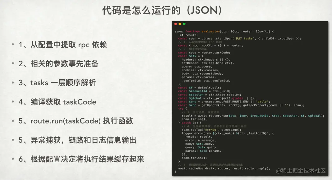 用户配置的数据会被写入 router 对象,并在运行时同步到 Redis 中。当请求到来时,我会先从 Redis 中获取这个数据。获取到的数据实际上是一个字符串。然后我们将 JS 字符串丢到 Node 提供的 vm 模块中,然后在 vm 内部运行的代码中,考虑到用户可能使用我们提供的 context 或者外部依赖 RPC 的情况,需要先将这些能力替换为特定的函数,这样 vm 才能正确识别这些数据。
