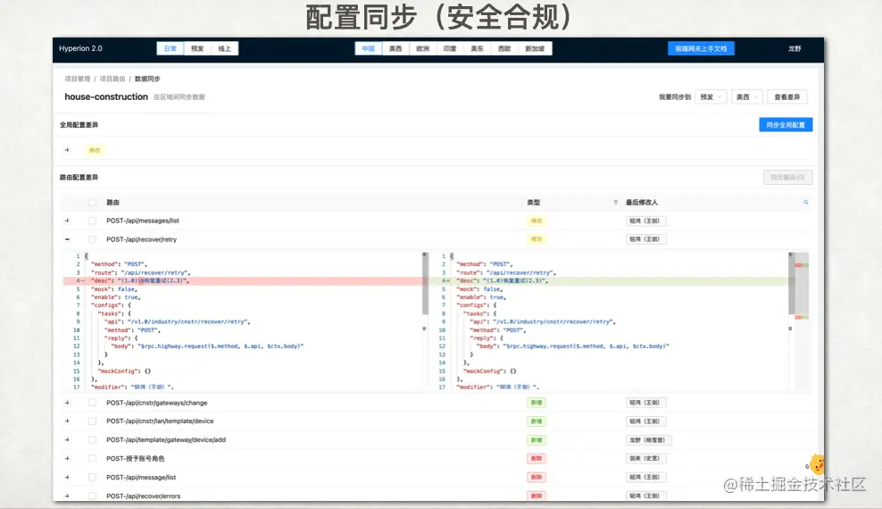 需要提一下,由于我们公司是一个全球化的业务场景,为了让用户在使用时不需要访问多个系统,以降低使用成本,我们开发了一个功能,让用户可以在一个系统上将数据配置分发到各个国家的数据库或 Redis 中。这种方式在安全性方面需要考虑一些因素,需要与公司的安全部门商讨,考虑各国家的政策,以确定数据是否能够传输到不同地区,具体根据各公司的情况而定。