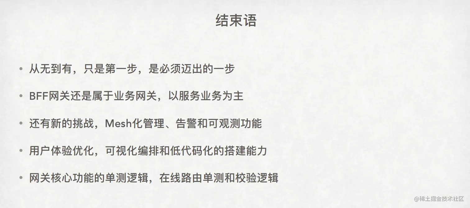 最后需要关注的是,我们正在开发一个业务服务的 BFF 网关,这将帮助解决一些痛点。随着业务的不断变化,我们还需要对这个 BFF 网关进行优化,因为业务需求千变万化。例如,刚才提到的管理方式的匹配化、后续的可观测性提升,提供低代码化或可视化的编排能力以提升用户体验等。此外,在线配置路由等功能时,需要提供在线和线下的单元测试,并对路由信息的相关参数进行完善的校验,这些都是我们需要尝试实现的一些目标。