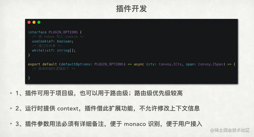 插件开发的模版如下图所示,需要先定义输入参数,并暴露一个函数作为插件的执行逻辑。业务方自己实现具体的业务逻辑,可以通过函数请求业务依赖的服务,也可以根据登录相关的数据来修改上下文中的内容。插件是作用在全局的整个项目中,配置某个插件后,每个路由都会默认使用该插件。如果特定路由不使用插件,则插件需提供路由白名单。