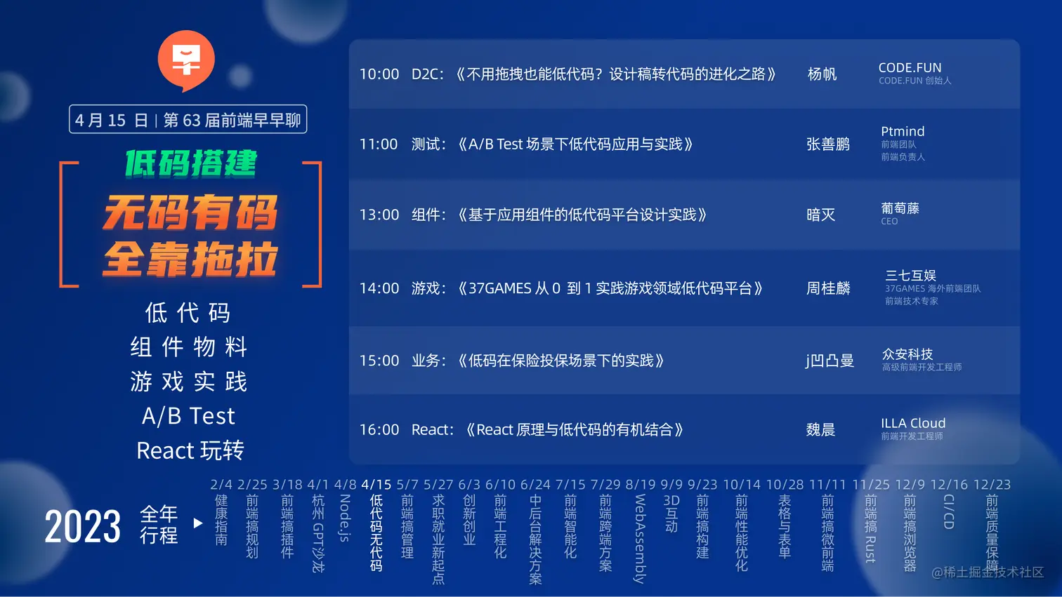 第 63 届早早聊大会将于 2023 年 4 月 15 日(本周六)举办 - 低代码搭建|无码有码 全靠拖拉,6 位讲师全天直播,关键词:低代码/组件物料/游戏实践/ AB Test /React 玩转。跟早早聊一起,学习低码搭建,上车链接:www.zaozao.run/conf/c63