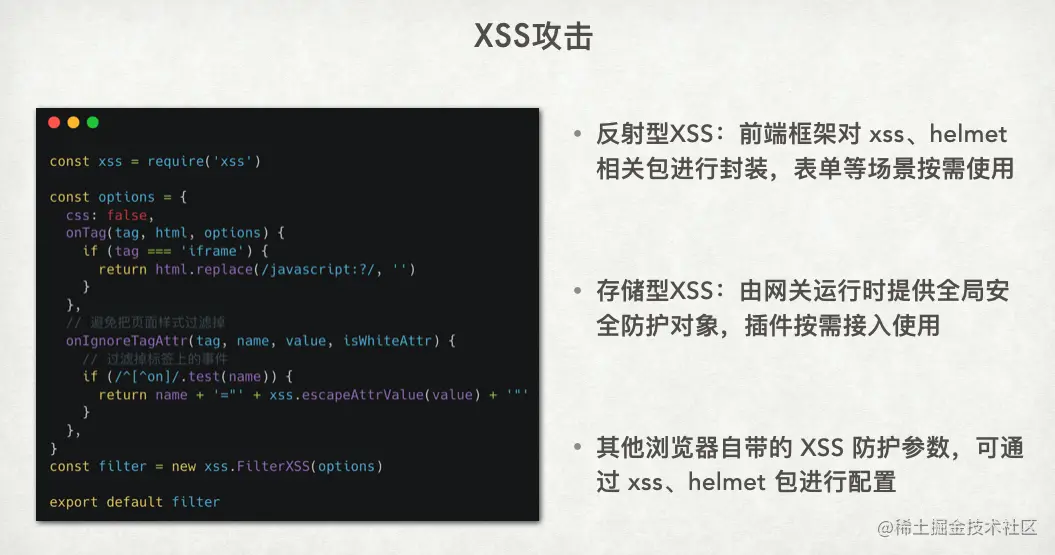 可以通过配置两种常见的包来配置 XSS 防护参数,一个是 XSS 包,另外一个是 Hamlet 包。在前端的场景中,一般会封装一个函数来使用这些包。在安全防护上,主要是增加安全攻击的难度,而不是完全避免。