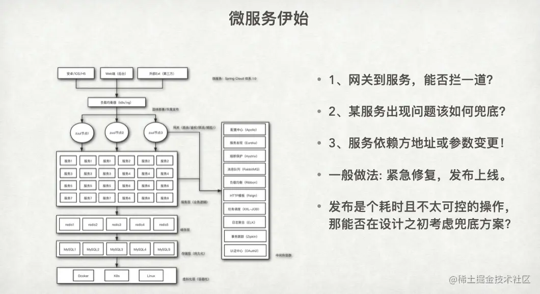 整个微服务大致是这样的,外部请求从用户端进来后,先经过负载均衡器,再到达一个外部网关,最后被转发到集群内部的各种服务,不论是 Java 还是其他语言的服务。在集群内部可能存在许多各式各样的服务,服务之间的上下层划分并不是非常明确。因此,外部网关到内部服务之间的边界并不是特别清晰。