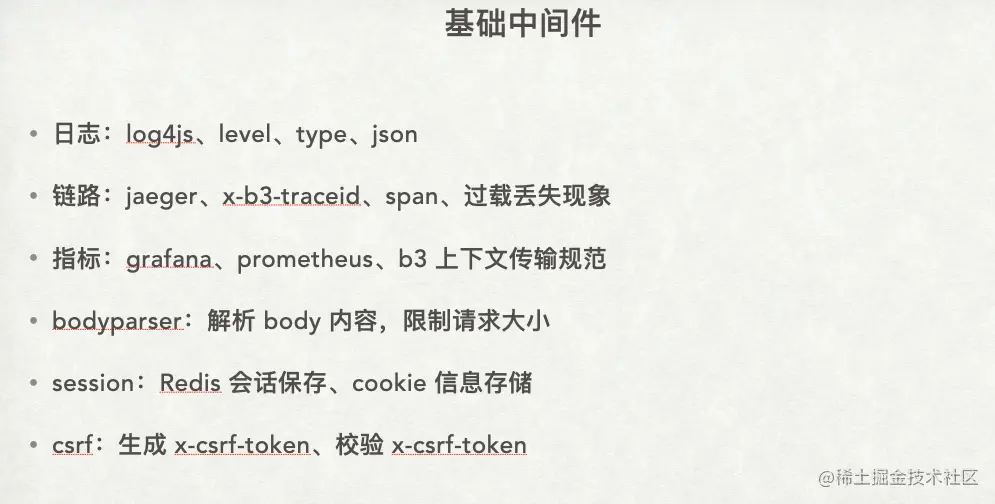 在常用的中间件中,由于暴露了 HTTP 服务,需要注意处理请求中的 body 数据,否则无法解析 POST 请求的 body。网关还有一个核心功能,即关于登录 session 的保存和 cookie 的处理。在后面的基础中间件中,还涉及到 CSRF 安全中间件,这将在后续详细讨论。