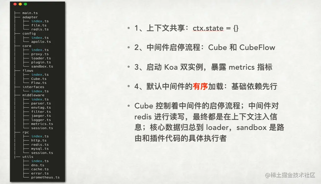 在图片左边我们还可以看到,main.ts 是请求进入的执行入口,在这个入口里面主要做了两件事情,启动运行时的监听端口,启动另外一个实例。这主要用于监听另外一个端口以暴露一些指标,例如当前网关服务的健壮性和运行时的历史记录统计信息等,供其他服务进行采集和告警。