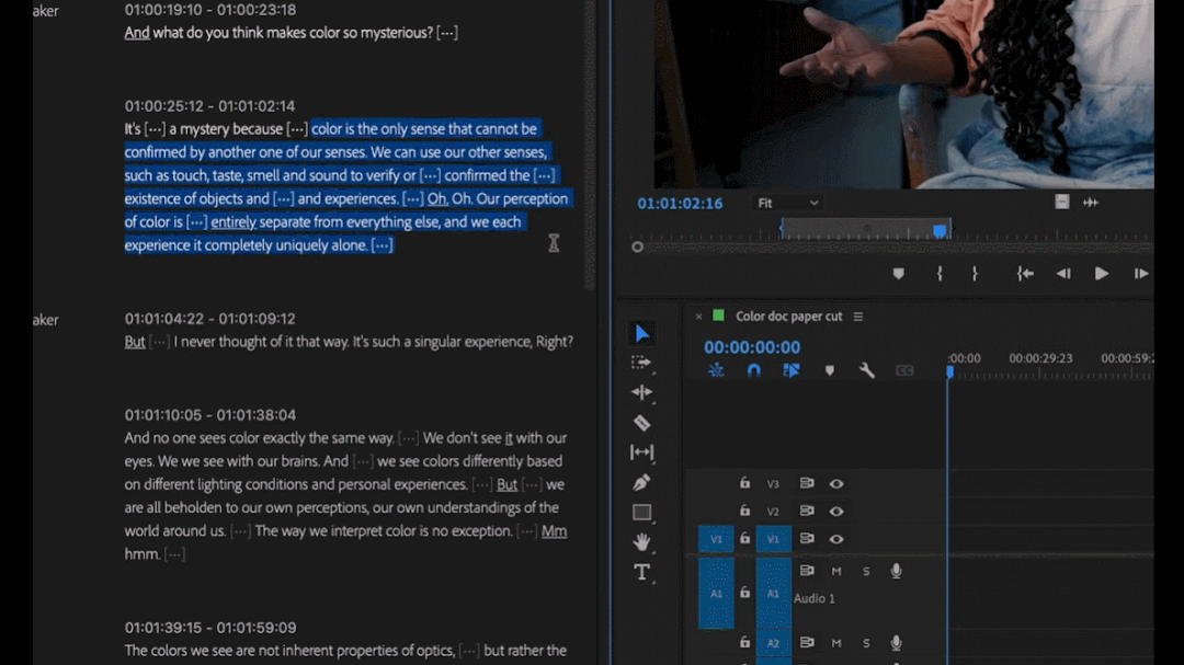 Premiere Pro 会在用户构建序列时为其生成转录副本。因此,一旦用户在时间线上获得了一些剪辑,就可以在序列转录副本中复制和粘贴文本短语,并观看时间线中的编辑自动更改来匹配操作。当编辑完成后,基于文本的编辑会为用户提供现成的文字记录,可用于快速生成字幕。