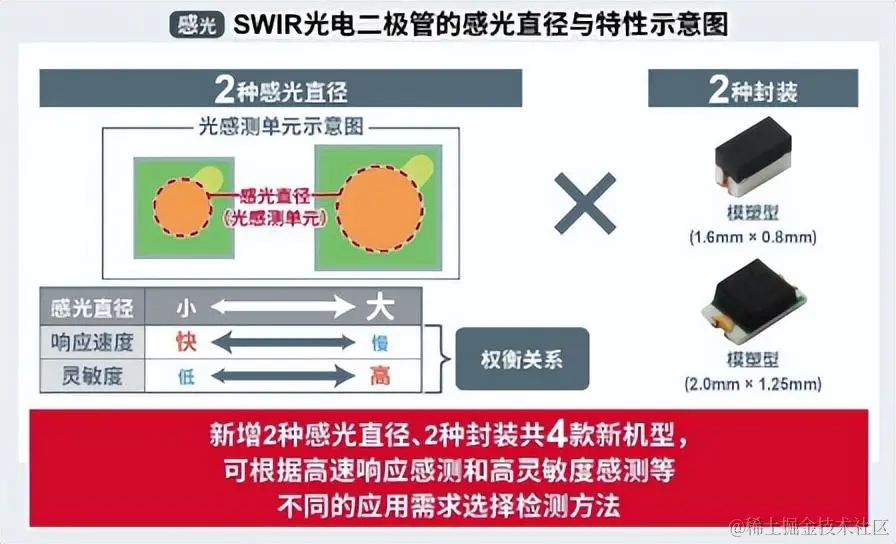 对于感光侧的SWIR光电二极管而言,存在一些权衡参数,比如光的检测面积小时要求响应速度要快, 面积大时要求灵敏度要高。因此,ROHM计划推出两种感光直径和两种封装相组合的共4款新机型。客户 可以根据高速响应感测用途和弱光检测用途等不同应用需求进行灵活选择。