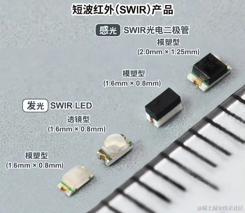 与近红外(NIR:Near Infrared)相比,SWIR的波长更长,对物质的穿透性更强,因透射或吸收物质不同,不易受阳光和烟雾等微小粒子的影响,这些特点将有望进一步扩大对有机EL显示器、水、气体和葡 萄糖等对象物的感测范围。另一方面,目前业内存在的问题是市场上的SWIR产品多为插装型,适用于通信 设备、工业分析设备等较大型应用, 而适用于小型应用的表贴型产品较少。