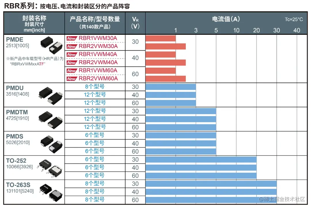 在RBR系列中,此次新增了12款2.5mm×1.3mm的PMDE封装产品(消费电子设备和车载领域各6款)。找正品元器件,上唯样商城,至此,该系列已经拥有140款产品(耐压:30V/40V/60V,电流:1A~40A),丰富的产品阵容可以满足节省空间乃至降低损耗的需求。