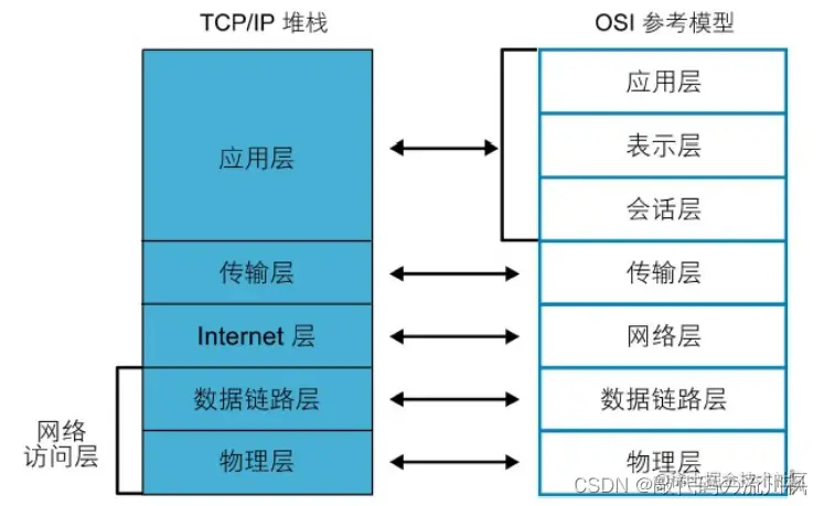 OSI 七层模型既复杂又不实用:所以 OSI 七层模型没有落地、实现。 实际组建网络时,只是以 OSI 七层模型设计中的部分分层,也即是以下 TCP/IP 五层(或四层)模型来 实现