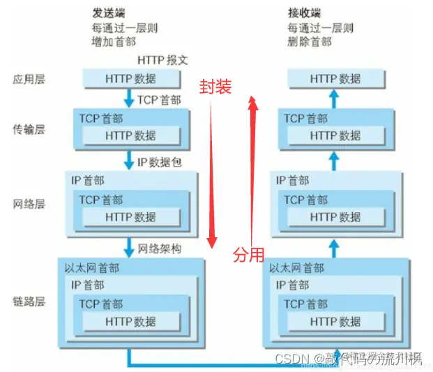 首部信息中包含了一些类似于首部有多长,载荷(payload)有多长,上层协议是什么等信息。 数据封装成帧后发到传输介质上,到达目的主机后每层协议再剥掉相应的首部,根据首部中 的 "上层协议字段" 将数据交给对应的上层协议处理