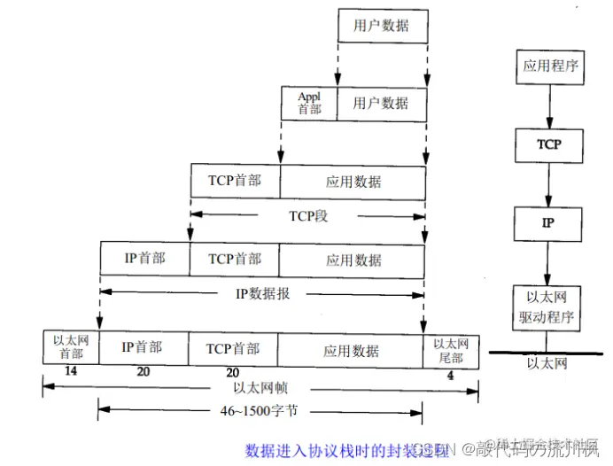 不同的协议层对数据包有不同的称谓,在传输层叫做段(segment),在网络层叫做数据报 (datagram),在链路层叫做帧(frame)。 应用层数据通过协议栈发到网络上时,每层协议都要加上一个数据首部(header),称为封装 (Encapsulation)