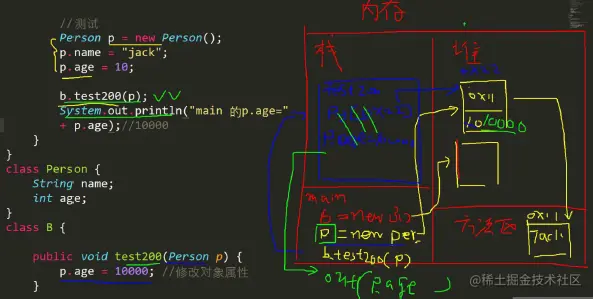 B 类中编写一个方法test200,可以接收一个Person(age,sal)对象,在方法中修改该对象属性,看看原来的对象是否变化?会变化.