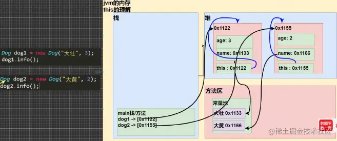 java虚拟机会给每个对象分配this, 代表当前对象。