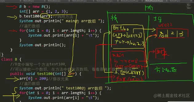 B 类中编写一个方法test100,可以接收一个数组,在方法中修改该数组,看看原来的数组是否变化?会变化