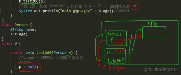 //测试题, 如果 test200 执行的是 p = null ,下面的结果是 10