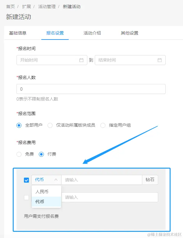 创建huo动时,选择付费模式下,在人民币的基础上新增了“代币”支付,方便iOS用户参与报名。