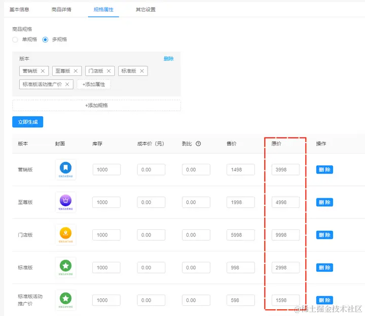 商城子系统的多规格商品,新增支持设置原价(划线价)的功能。