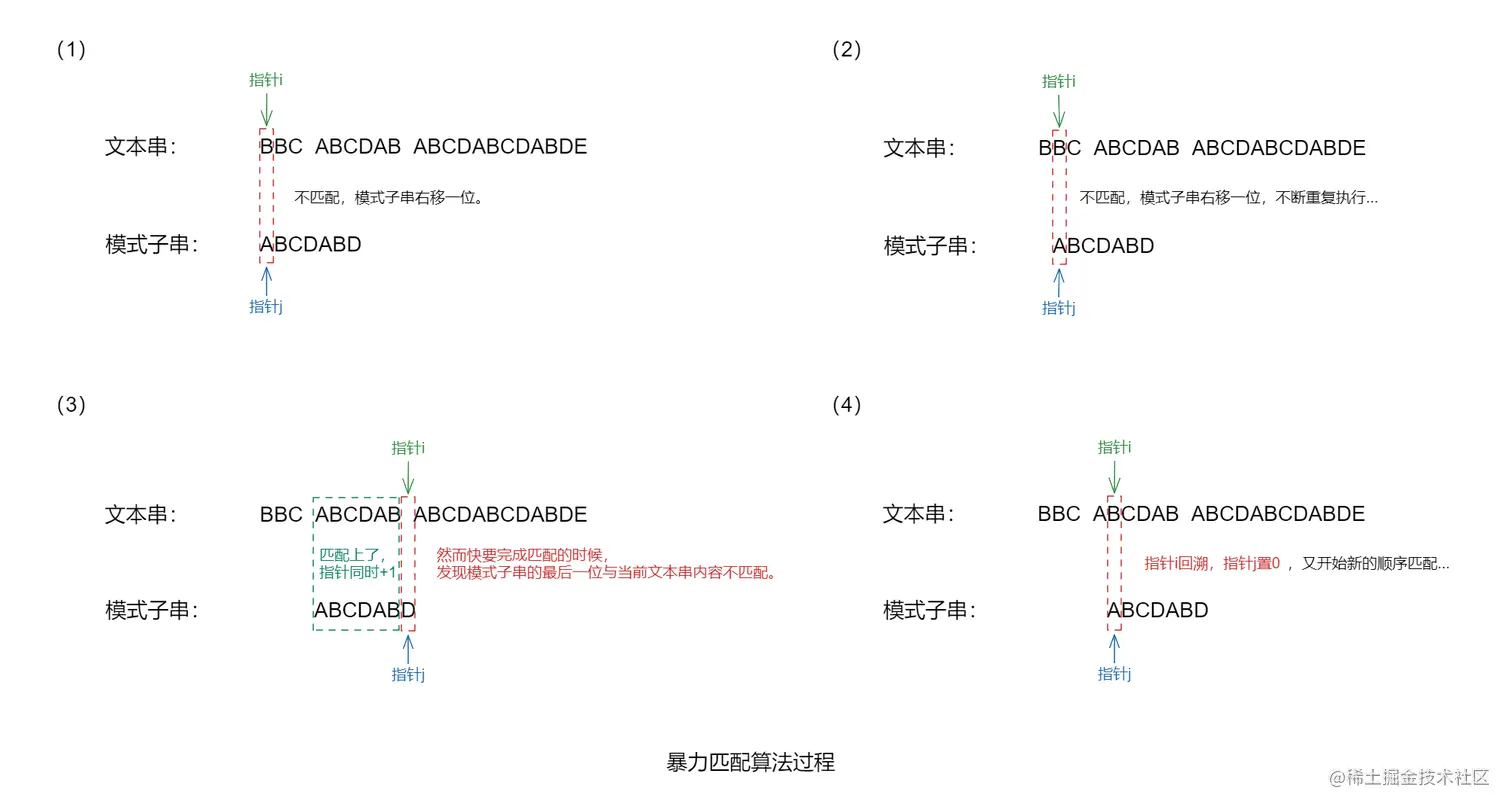 缺点:匹配效率不高,特别是在长文本和子串的情况下(会有大量的回溯,每次只移动一位,若是不匹配,移动到下一位接着判断,浪费了大量的时间)。