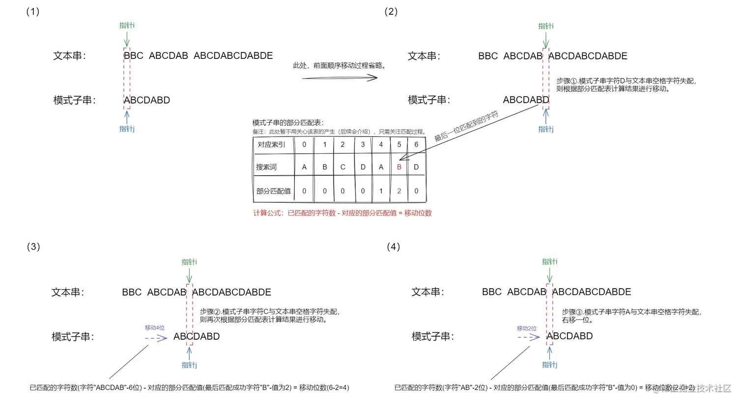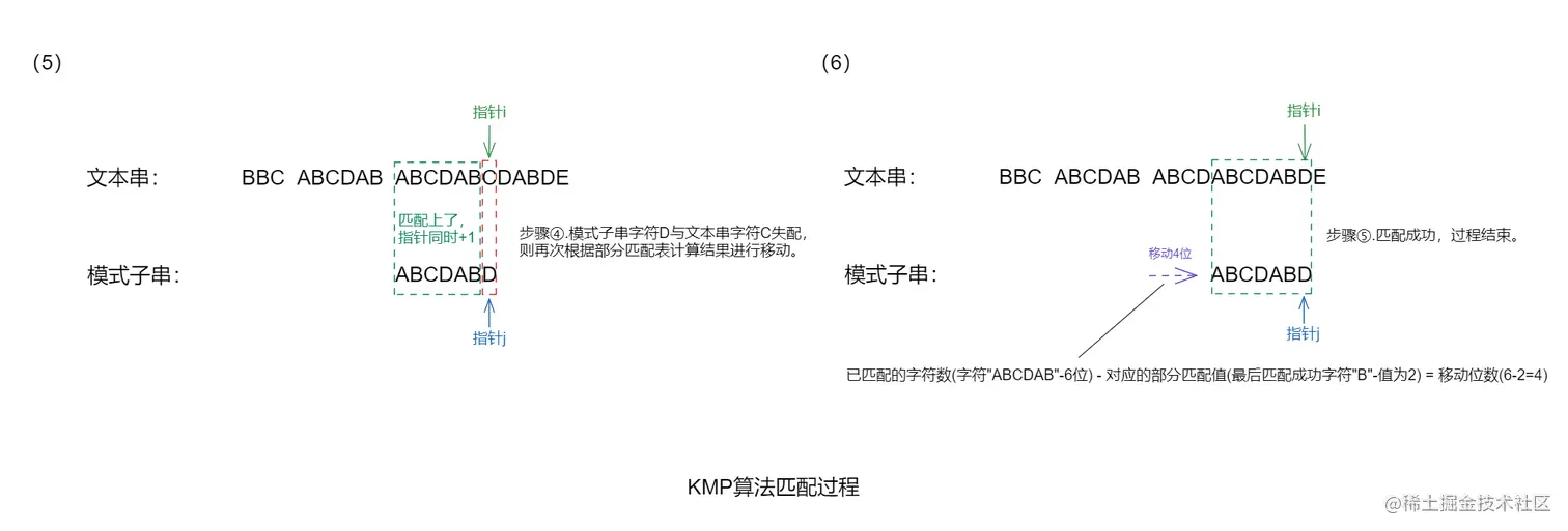 ”部分匹配”的实质是有时候字符串头部和尾部会有重复。比如,”ABCDAB”之中有两个”AB”,那么它的”部分匹配值”就是 2(”AB”的长度)。搜索词移动的时候,第一个”AB”向后移动 4 位(字符串长度- 部分匹配值),就可以来到第二个”AB”的位置。
