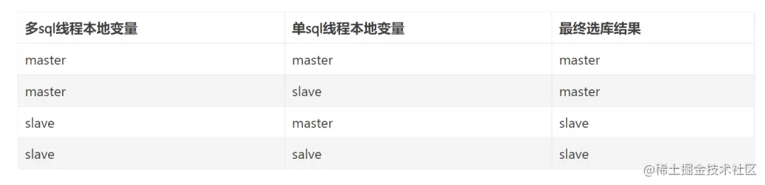 * 判断当前线程是否为使用从库为数据源. 最外层service有slave的aop标签 或者 service没有aop标签且单条sql为DQL