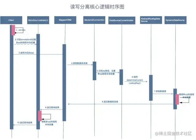 1、读写分离设计核心点——路由支持每条 SQL 按照 DML、DQL 类型的默认路由。需求描述目前公司采用读写分离的方案来增强数据库的性能,所有的 DML(insert、updata、delete)操作在主库,通过 MySQL 的 binlog 同步,将数据同步到多个读库。所有的 DQL(select) 操作主库或从库,从而增强数据的读能力。支持方法级别的指定路由需求描述在 Service 中指定方法中所有 DB 操作方法操作同一个数据库(主要是主库),保证方法中的 DB 读写都操作主库,避免数据同步延迟导致读从库数据异常。从而保证整个方法的事务属性。解决思路我们将获取真实数据库(主库还是哪个从库)放到需要建立连接时的地方,为此我们创建了 BackendConnection(传统是先连接数据库,然后再创建连接)。在获取数据库连接时,通过对请求的 SQL 进行解析和类型判别,识别为 DML 和 DQL。如果是 DML,则在线程的单 SQL 线程本地变量上设置为 master,DQL 则设置为 slave,为后续选择数据库提供选择参考。如果要支持方法级别的事务(也就是整个方法的 SQL 请求都发送到主库),需要借助拦截器,我们采用的是 AspectJ 方式的拦截器。会拦截所有带有类型为 dataSourceType 的 annotation 的方法。在执行方法前,在线程的多 SQL 线程本地变量上设置 dataSourceType 的 name 值(name 值为 master 代表走主库,name 值为 slave 代表走从库)。线程的多 SQL 线程本地变量为后续选择数据库提供选择参考。在方法执行完后,清理本地线程变量。多 SQL 线程本地变量的优先级高于单 SQL 线程本地变量的优先级。