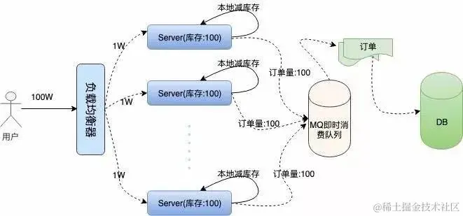 从上面的介绍我们知道用户秒杀流量通过层层的负载均衡,均匀到了不同的服务器上,即使如此,集群中的单机所承受的 QPS 也是非常高的。