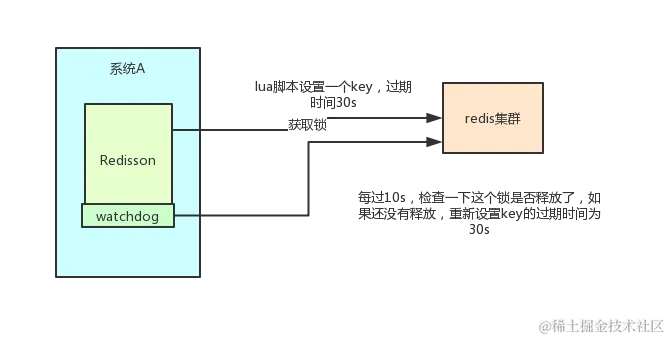redisson中有一个watchdog的概念,翻译过来就是看门狗,它会在你获取锁之后,每隔10秒帮你把key的超时时间设为30s