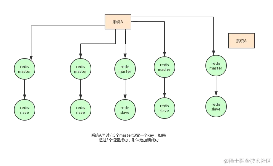 轮流尝试在每个master节点上创建锁,过期时间设置较短,一般就几十毫秒