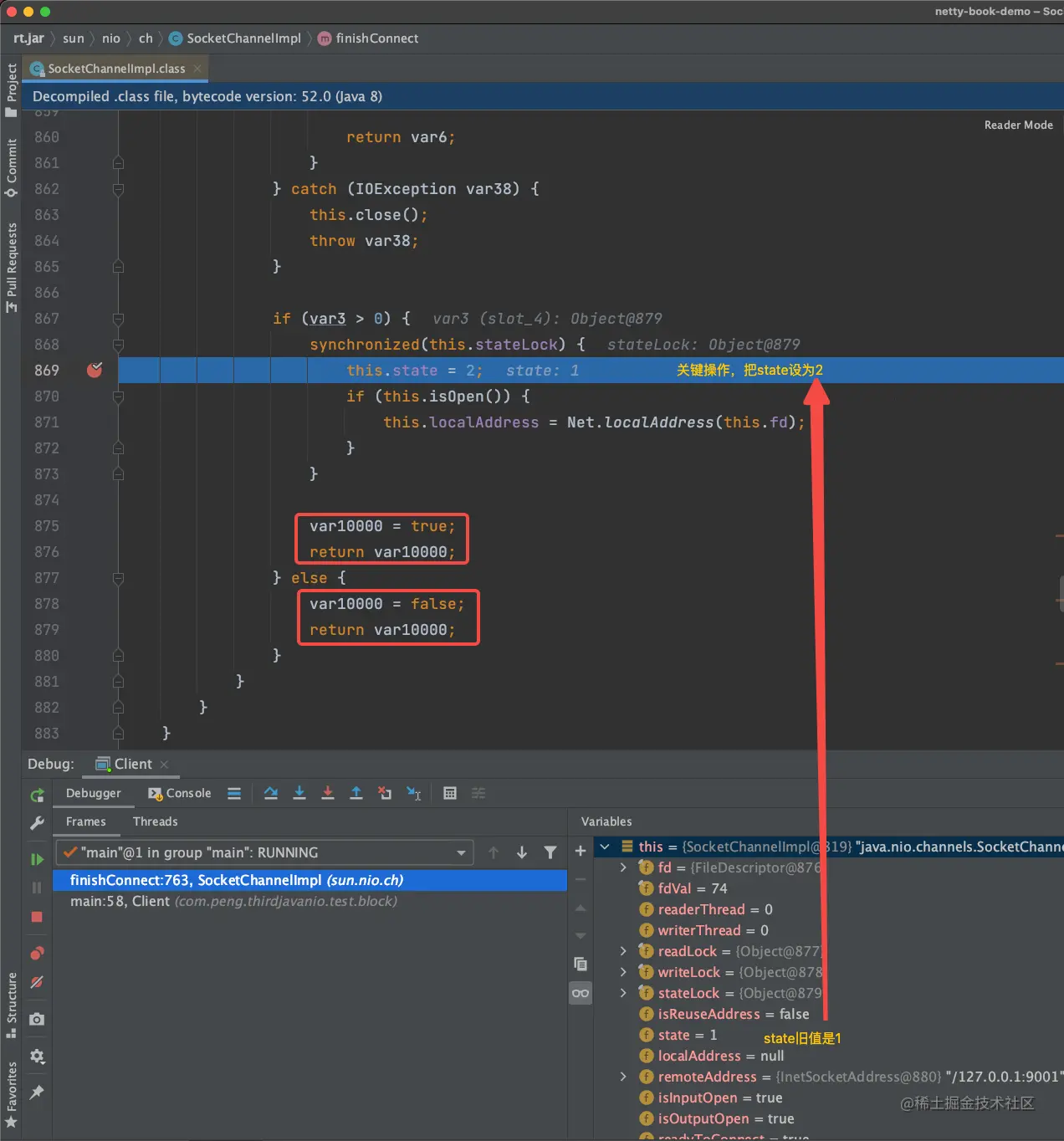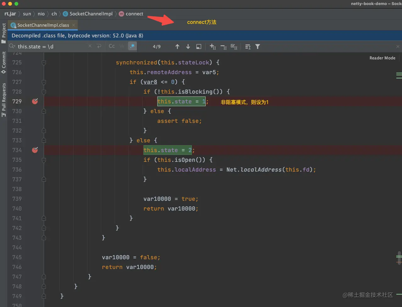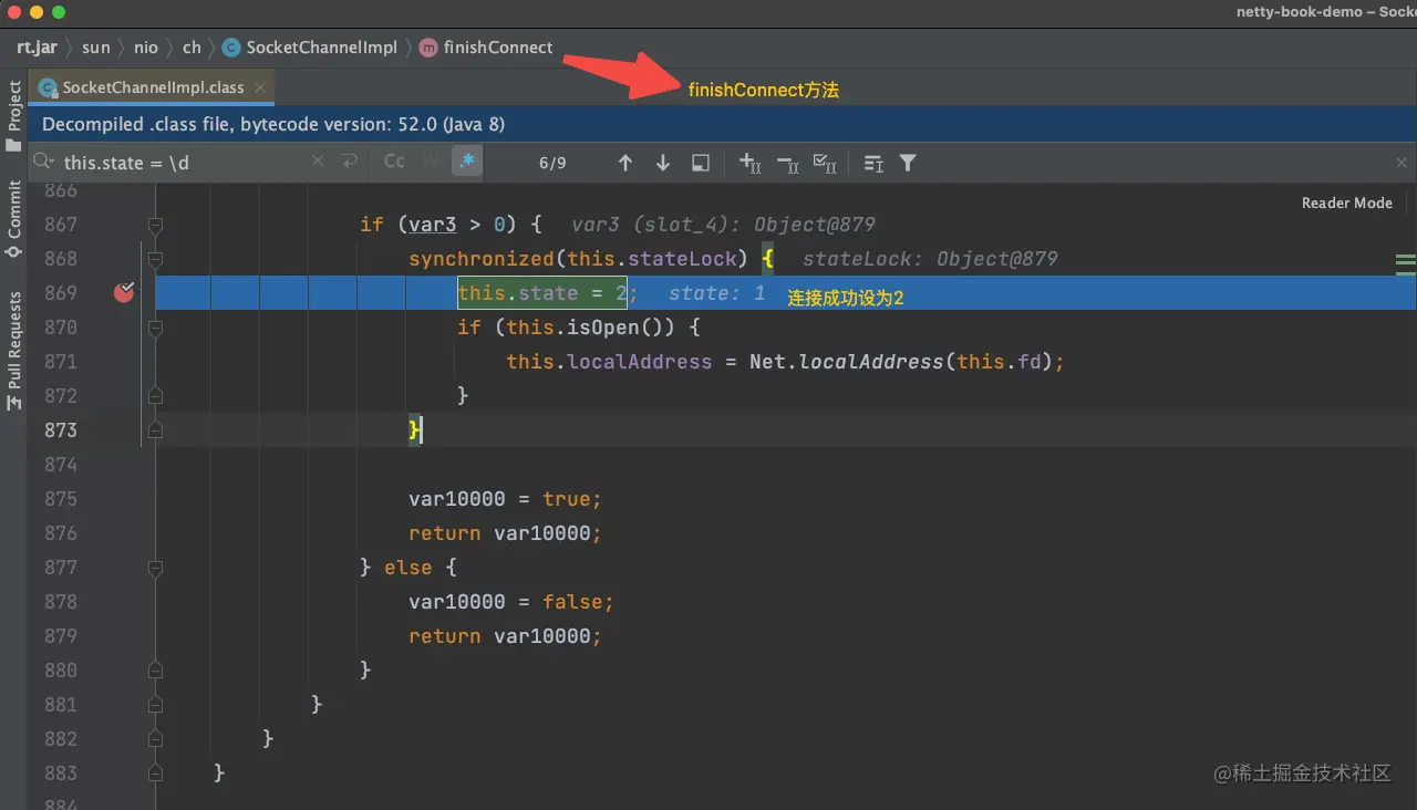 根据源码可以看到,this.state必须等于2,才能正确添加可读和可写事件到「就绪事件集」中,所以必须调用finishConnect方法。