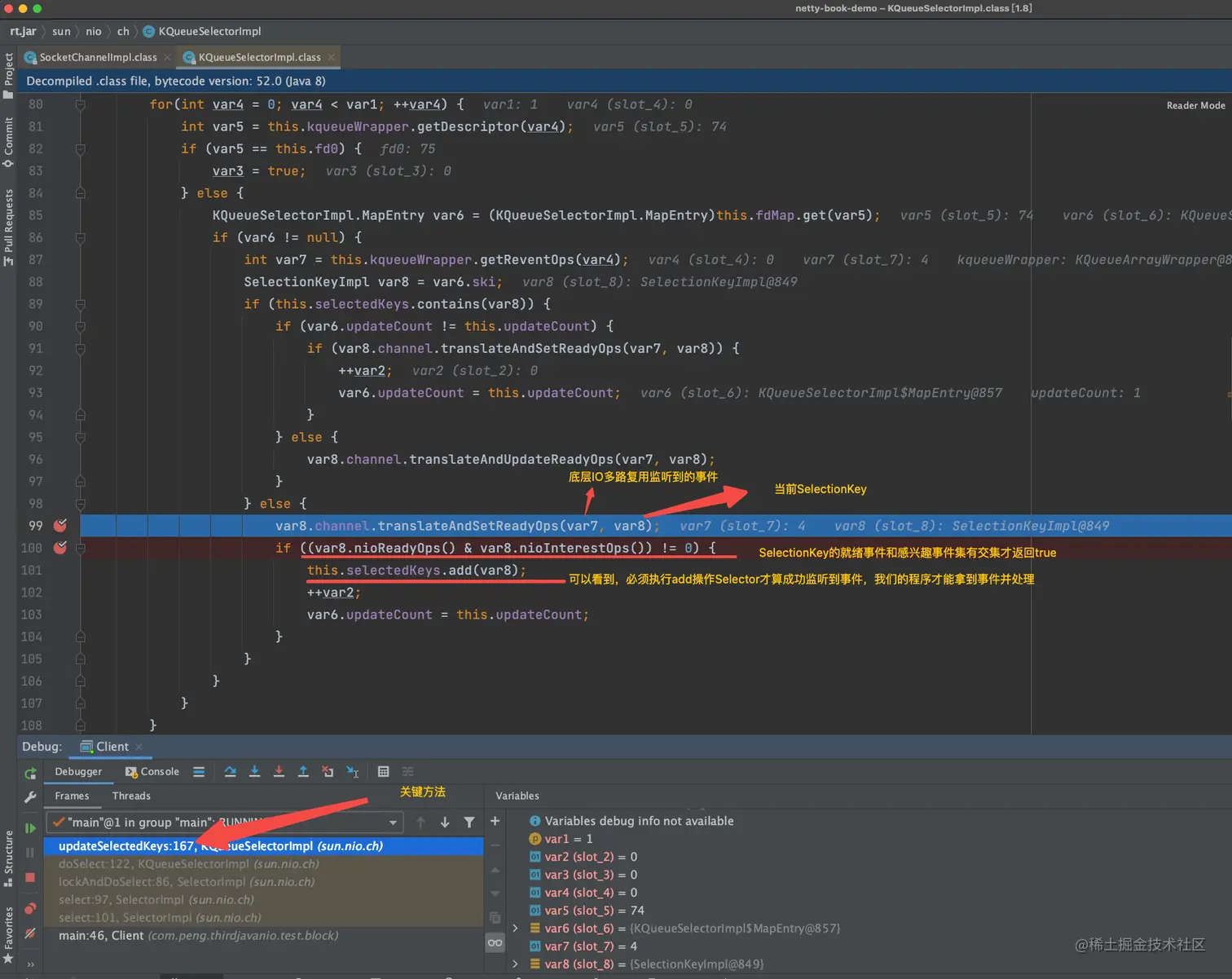 // 入参解释:根据debug发现,var1是底层IO多路复用监听到的事件;var2等于0;var3是当前SelectionKey对象