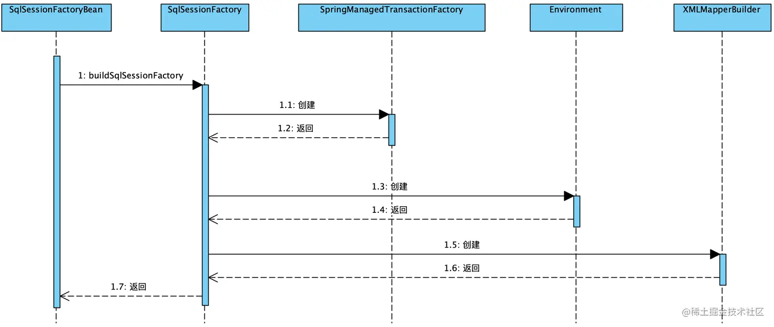 由于MapperFactoryBean实现了FactoryBean,在Bean生命周期管理时会调用getObject方法,通过JDK动态代理生成代理对象MapperProxy,Mapper接口请求的时候,执行MapperProxy代理类的invoke方法,执行的过程中通过SqlSessionFactory创建的SqlSession去调用Executor执行器,进行数据库操作。下图是SqlSession创建的整个过程: