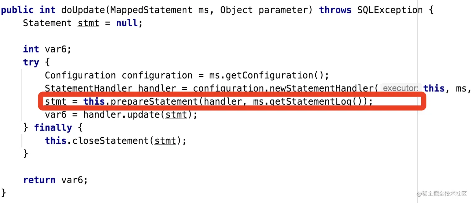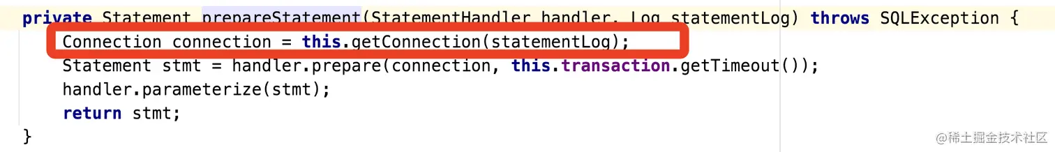 这里通过Configuration.newExecutor()创建一个Executor,Configuration指定在Executor默认为Simple,因此这里会创建一个SimpleExecutor,并初始化Transaction属性。接下来我们来看下SimpleExecutor执行执行update方法时候执行prepareStatement方法,在prepareStatement方法中执行了getConnection方法,