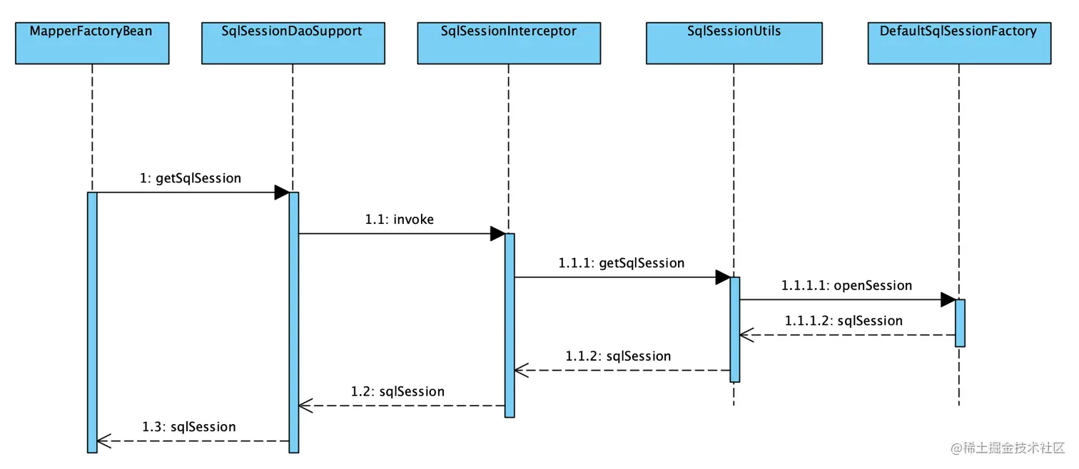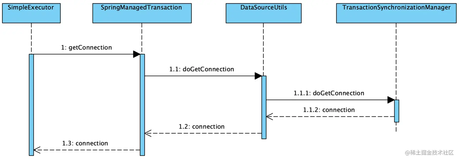 这里我们可以看到Connection获取过程,是通过Transaction获取的getConnection(),也就是通过之前注入的Transaction来获取Connection,这个Transaction就是SpringManagedTransaction,整体的时序图如下: