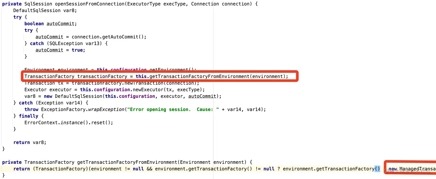 openSession方法是将Spring事务管理关联起来的核心代码,首先这里将通过 getTransactionFactoryFromEnvironment()方法获取TransactionFactory。这个操作会得到初始化时候注入的 SpringManagedTransactionFactory对象。然后将执行TransactionFactory#newTransaction() 方法,初始化 MyBatis的Transaction。