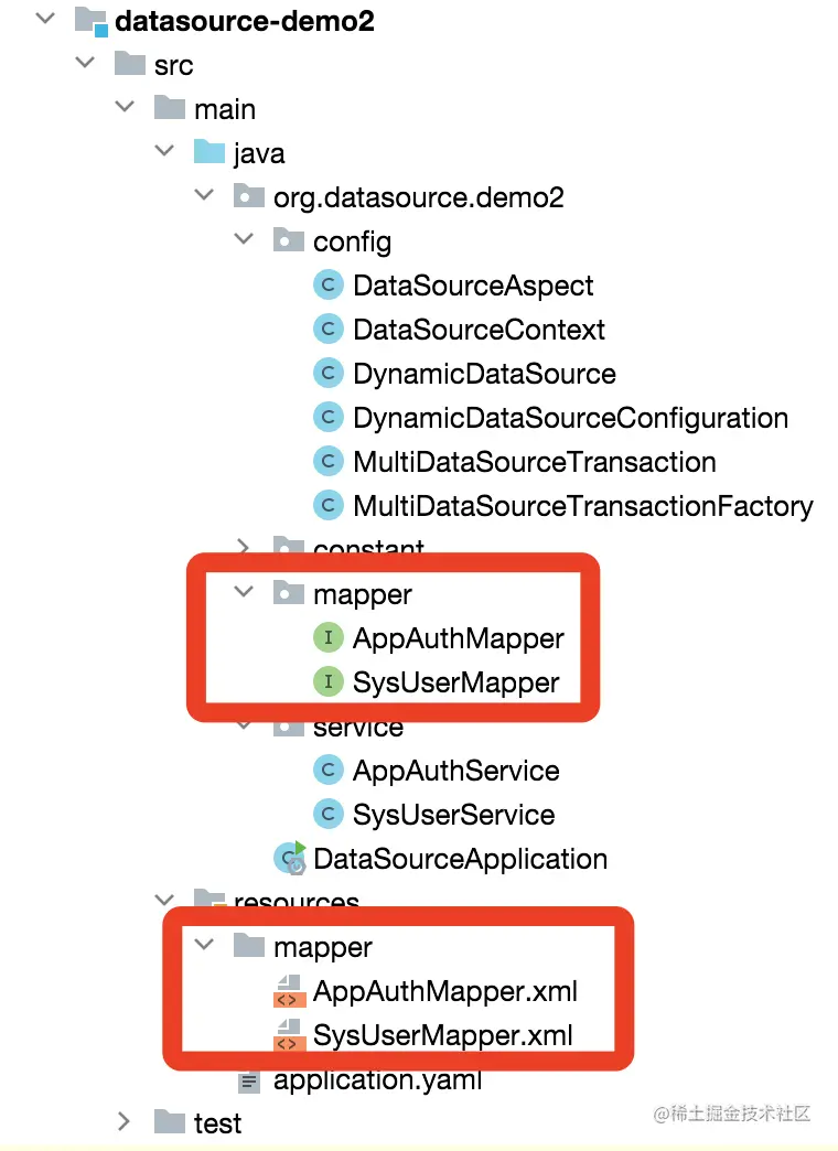 该种方式需要操作的数据库的Mapper层和Dao层分别建立一个文件夹,分包放置,整体项目结构如下图: