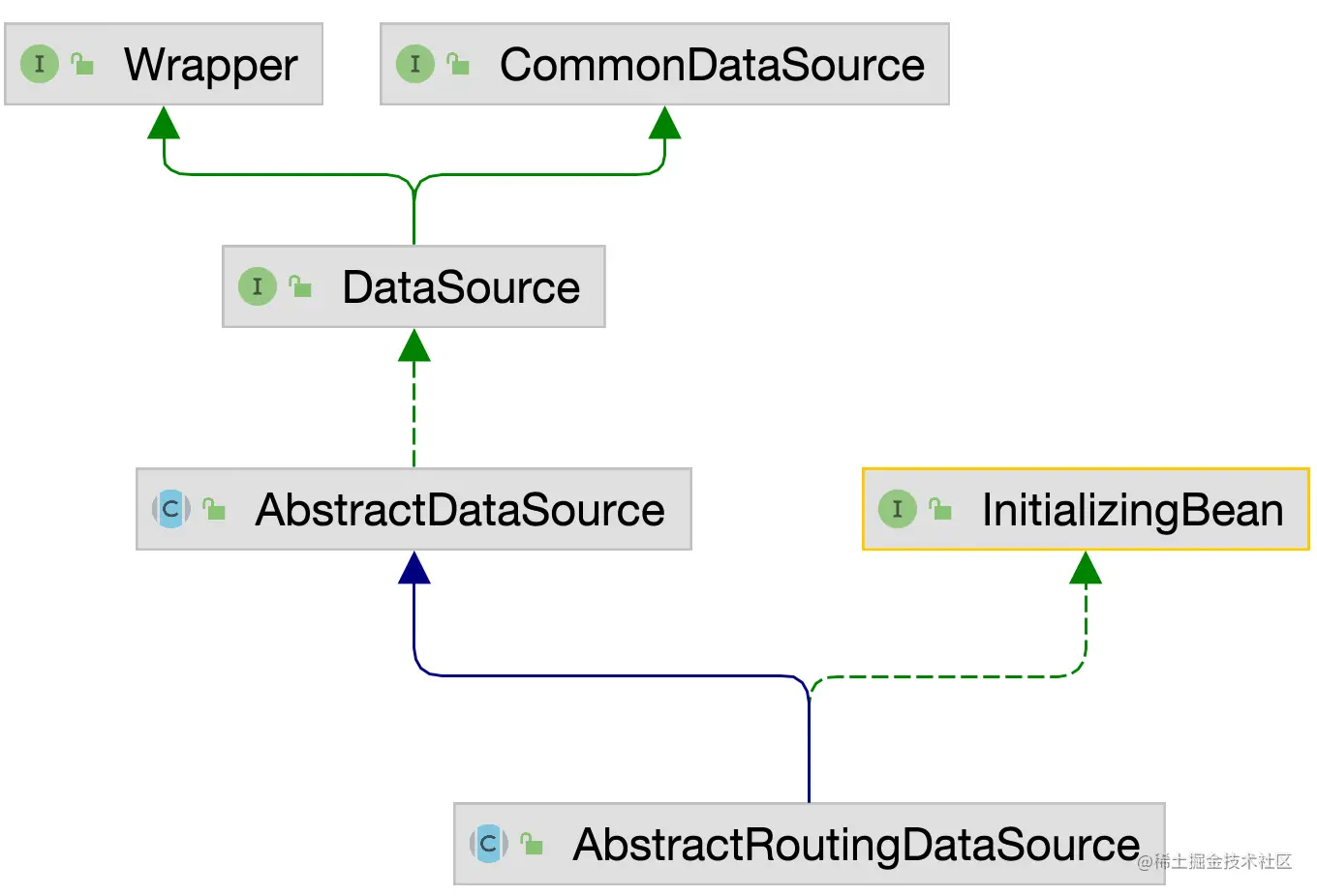 ImportBeanDefinitionRegistrar接口是Spring提供一个扩展点,主要用来注册BeanDefinition,常见的第三方框架在集成Spring的时候,都会通过该接口,实现扫描指定的类,然后注册到Spring容器中。比如 Mybatis中的Mapper接口,SpringCloud中的Feignlient接口,都是通过该接口实现的自定义注册逻辑。 我们要做的事情就是通过ImportBeanDefinitionRegistrar帮助我们动态的将DataSource扫描的到容器中去,不在采用增加Bean的方式,整体代码如下: