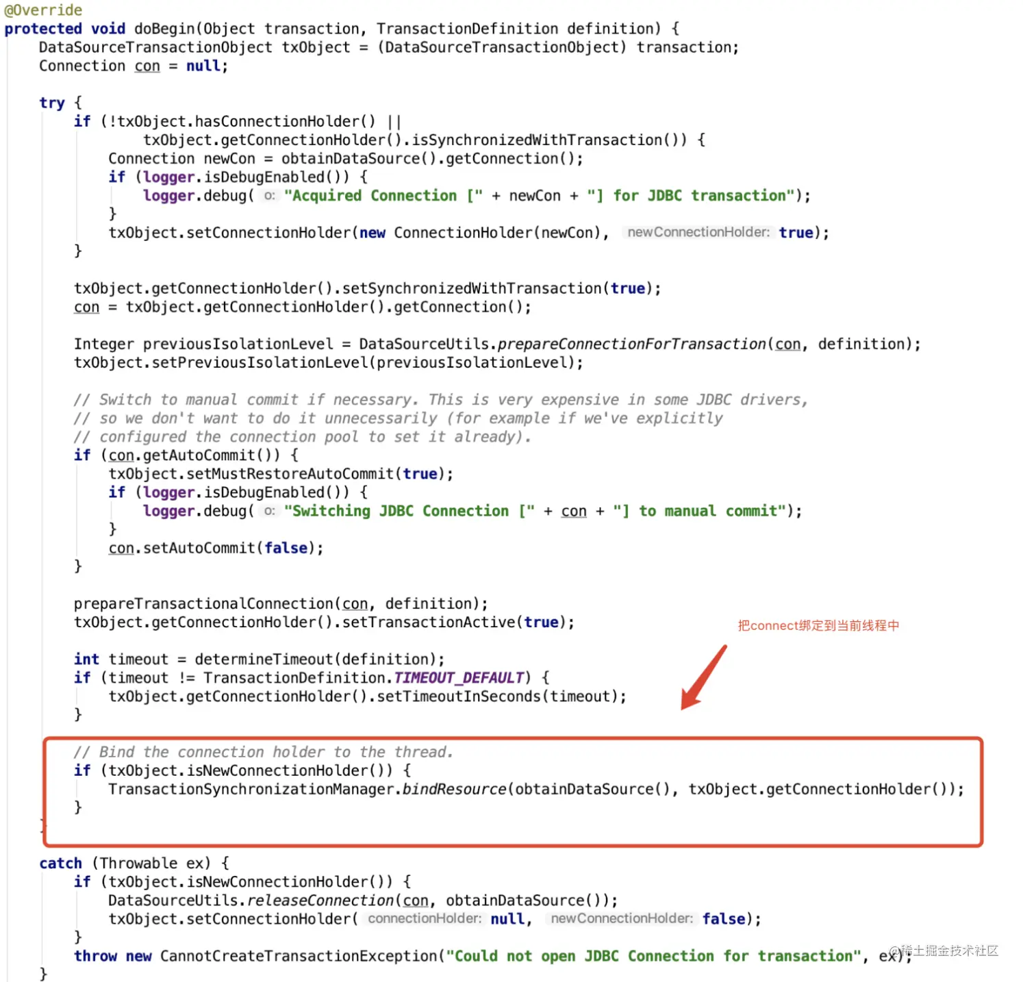 在整个调用链过程中,我们看到在DataSourceUtils有我们熟悉的TransactionSynchronizationManager,在上面Spring事务的时候我们也提到这个类,在开始Spring事务以后就会把Connetion绑定到当前线程,在DataSourceUtils获取到的Connection对象就是Srping开启事务时候创建的对象,这样就保证了Spring Transaction中的Connection跟MyBatis中执行SQL语句用的Connection为同一个 Connection,也就可以通过Spring事务管理机制进行事务管理了。