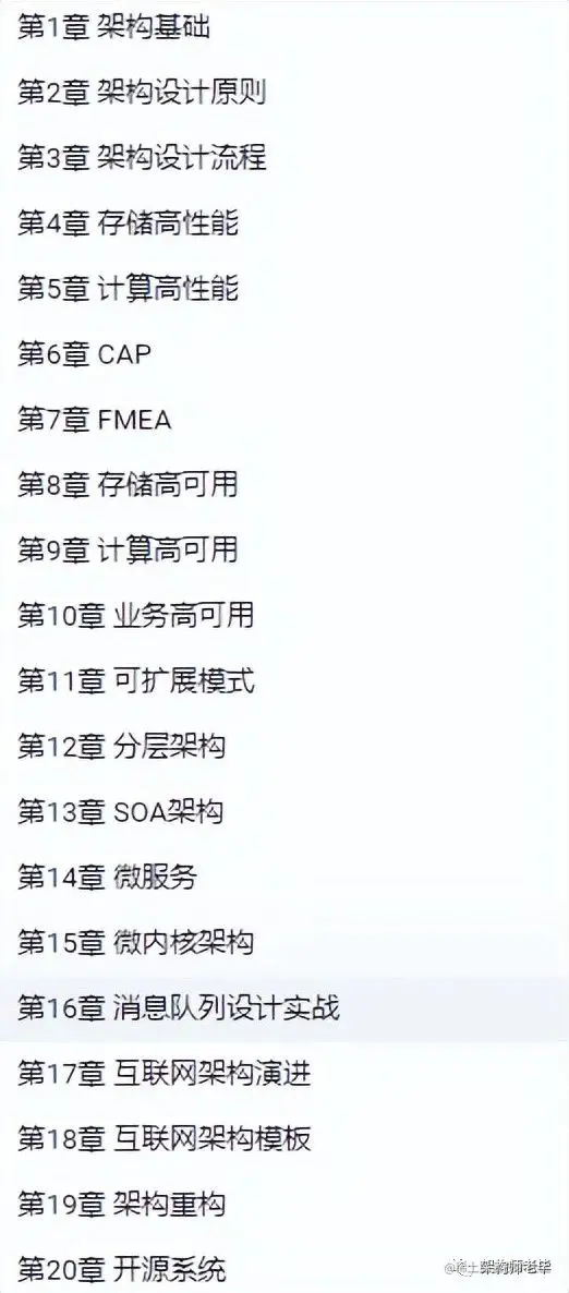 主要内容:架构基础,高性能、高可用、高拓展架构模式与实战经验