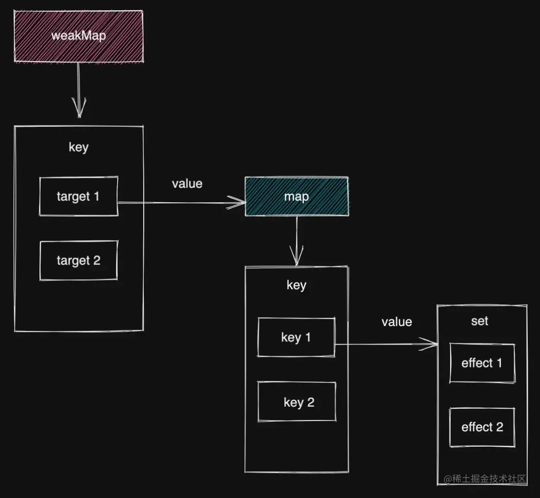 trigger 函数会从 targetMap 中获取响应式依赖集合,也就是需要执行的副作用函数,然后通过 triggerEffects 方法执行获取到的副作用函数