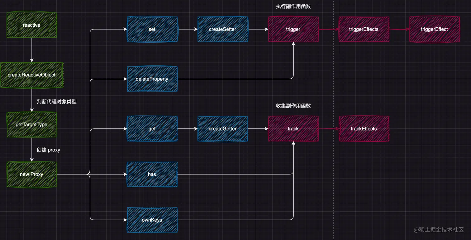 这三个方法也是在对属性做删除、查询属性、查询属性 key 时,做响应式操作。deleteProperty 方法在删除属性时执行 trigger 执行副作用函数,has 和 ownKeys 查找属性时执行 track 收集副作用函数