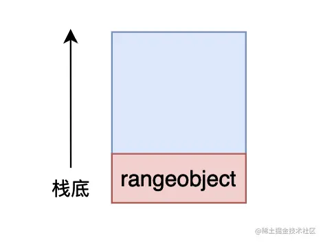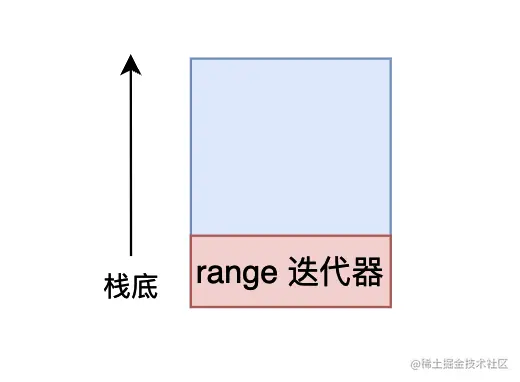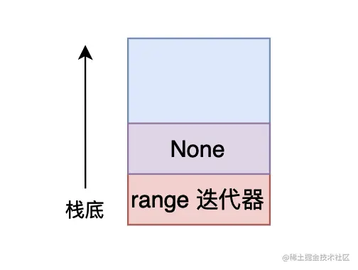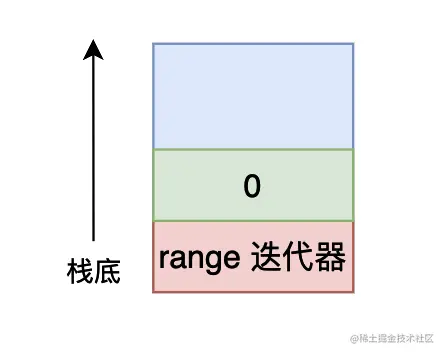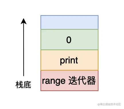 - 如果没有迭代完成则将函数的返回值压入栈顶,并且不需要弹出迭代器,比如当我们第一次调用 __next__ 函数的时候,range 的返回值为0,那么此时栈空间的内容如下所示: