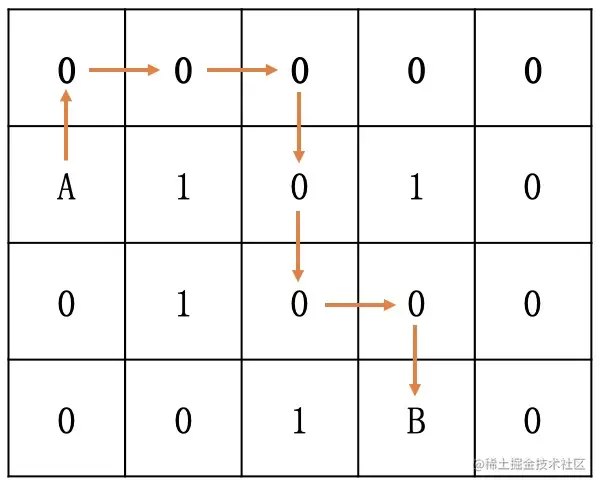第2条路径:(1, 0) -> (2, 0) -> (2, 1) -> (2, 2) -> (2, 3) -> (3, 3),路径长度为5;