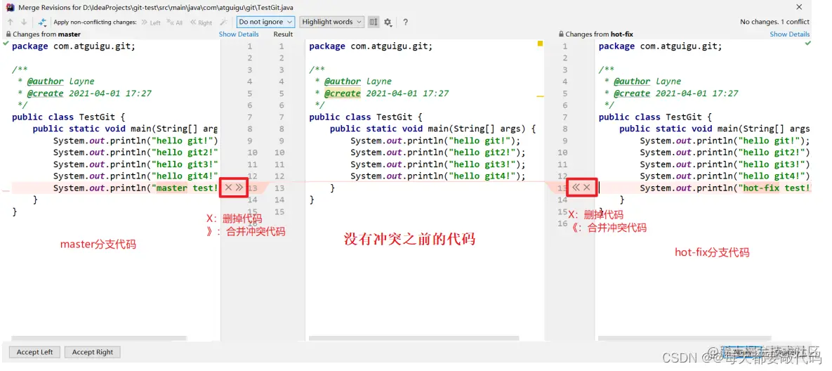 现在站在 master 分支上合并 hot-fix 分支,就会发生代码冲突