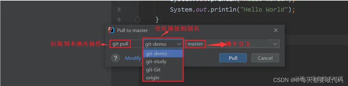 注意: pull 是拉取远端仓库代码到本地,如果远程库代码和本地库代码不一致,会自动 合并,如果自动合并失败,还会涉及到手动解决冲突的问题。