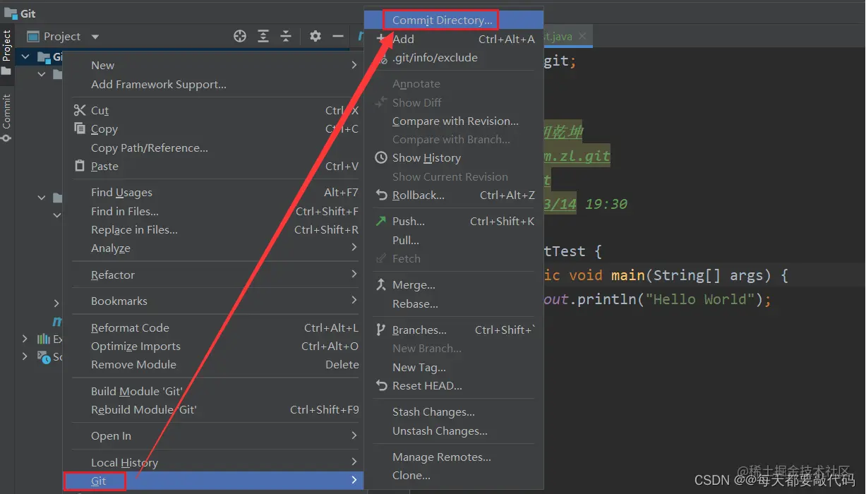 右键点击项目选择 Git -> Commit Directory将项目提交到本地库!