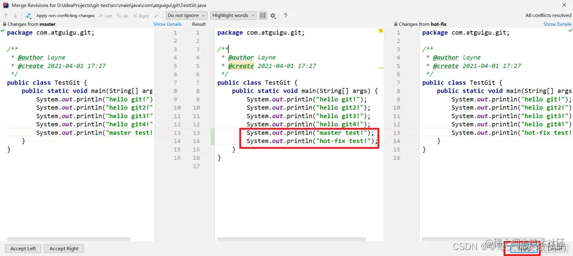 注:此时master分支是两个分支合并后的结果,而hot-fix分支还是原来的结果!并且代码冲突解决,是自动提交本地库!
