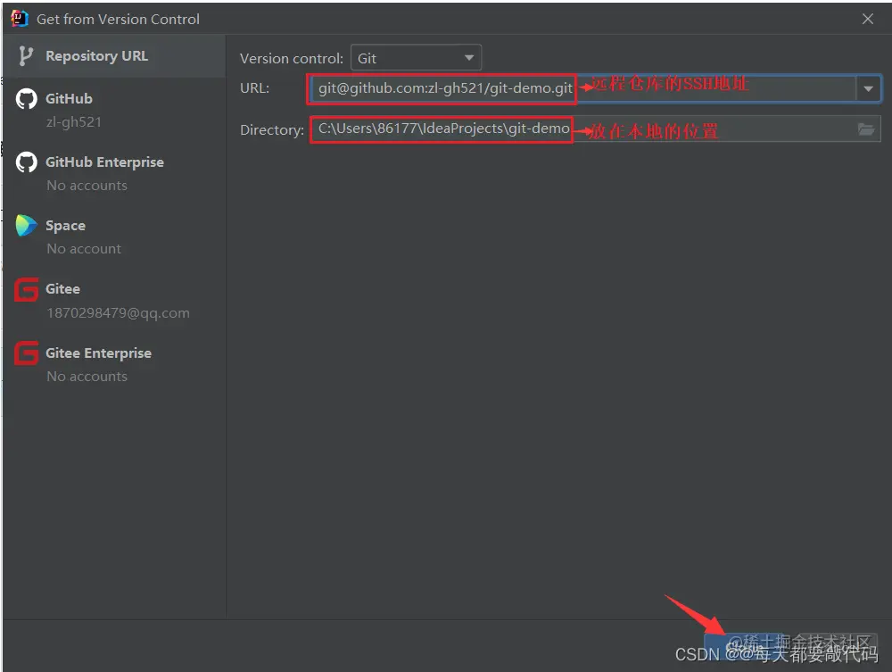 输入远程仓库的地址, 并确定拉取的项目放在本地的那个位置