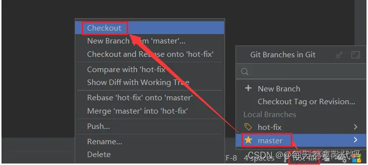 此时是在hot-fix分支,切换到master分支